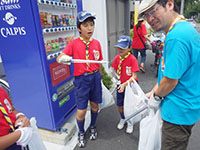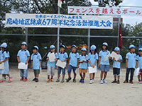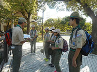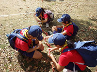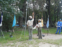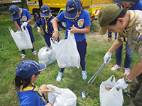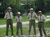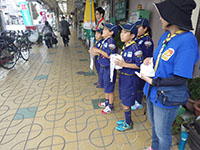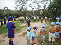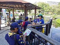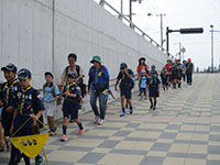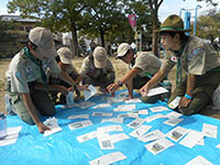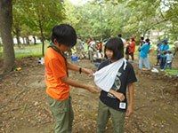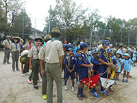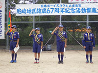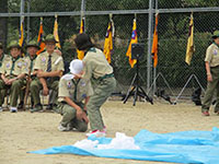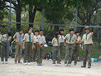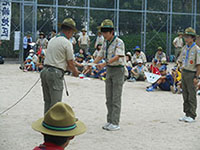 ボーイ隊も地区推進大会に参加しました。午前中は4つのコーナーを巡るスカウトレスキュー隊、午後からは式典ですが、その前に各団ボーイ隊対抗救護ゲームがあるのです。尼崎地区全スカウトが見ている前で急造担架つくりと仮包帯をするタイムトライアルです。7団代表はNASYUスカウトと6年生のMEIスカウト。スタートとともに素早く急造担架を作り、仮包帯もOKでトップゴール。ところが、二組目の10団チームに数秒差で負け第2位に。しかし仮包帯の正確さは格段の差があり、実質的には断然1位の価値ありでしたが、開催地元に花をもたせるということで矛を収めましょう。(K3)