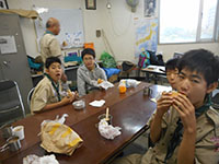 待ちに待った都市交歓、が…出発前から台風の予報!? 今回は本当に台風に翻弄される都市交歓です。でも、スカウトたちは元気いっぱい。『しあわせはこぼう』のテーマで、但馬のスカウトとの交流から始まります。雨という事で狭い宿舎の中で行いましたが、各チーム白熱した戦いを繰り広げ5組が優勝を勝ち取りました。夜のキャンプファイヤーも、2階で室内形式でしたが、スタンツがよく見えてかえって良かったかも? 2日目は残念ながら予定を切り上げ、コウノトリの郷公園のみとなりましたが、私たちのためにコウノトリのことを説明してくださり、ちょうど飛び立つところも目の前で見ることができました。予定外が多い都市交歓だったけど、スカウトたちの持ち前の元気とポテンシャルで、楽しい、思い出に残る都市交歓になったと思います。今年は、7団からもスカウト9名、リーダー3名の大所帯で参加し、地区での存在感もあったかな。(M34)