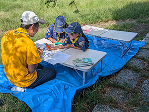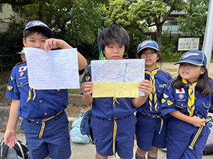 秋晴れのさわやかな日、隊集会日和です。今日は、竹谷公園までの行き道で『あそびマップ』を作ろうということで、みんなの足で公園の様子を確かめ、簡易イラストマップにしました。組ごとに、まわる公園も違いましたがやはり『尼崎城址公園』はどちらの組にも人気。昼は、しかスカウトの『野外料理』クリアのため親子丼。指導者としかスカウトで調理しました。かなり上出来。カブラリーも終わり、ゆったりとした隊集会になりました。(M34)