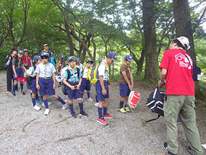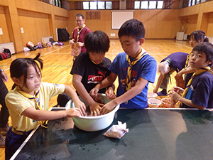 最終日、若干の悪天候ですがプログラムは『草木染め』なので、実施出来そう。1日目からお世話になった施設の方の指導を受けて、自分たちの作品を作りました。最後に、優秀組(1組)の発表や優秀スカウト、リーダー賞の発表をして、六甲の山から下りてきました。(M34)