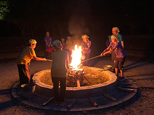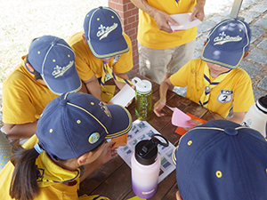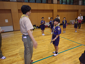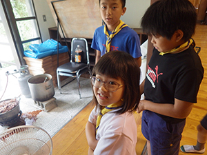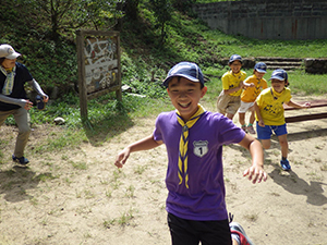 2日目もよい天気で、朝は同泊の西宮27団と合同で朝礼です。ジャンケンゲームやスカウツオウンなどを通して交流を深めました。2日目の最初のプログラムは飯盒炊爨です。ご飯とハッシュドビーフを屋外で調理、事前の集会で調理の練習をしたからか、かなりスムーズに出来上がりました。少し休憩をはさんで、午後はカヌー体験とネイチャービンゴ。カヌーから落ちるスカウト(指導者)もなく、神戸の自然を堪能しました。夜はいよいよキャンプファイヤー、くまスカウトの点火も立派につとめ、大成功でした。(M34)