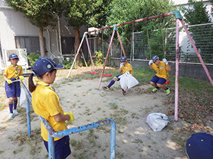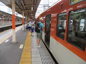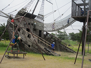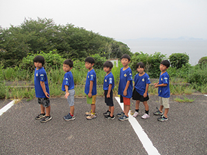 舎営二日目、薄曇りで昨日までのかんかん照りからは開放されました。が天気予報は雨。起きてすぐ寝具かたづけを行い、外での体操、おめざの梅干し。そろいの新しい活動着での写真撮影。しっかりと朝ご飯を食べすぐに出発準備をして、宿舎点検をしてもらい、120%の出来とお褒めの言葉をいただきました。またまたバスに乗り、一番近い(2km)バス停から海浜公園まで歩きます。再訪した海浜公園は月曜、雨模様でほとんど人影がありません。プレイランドの遊具、海賊難破船も独占状態でしたが、雨脚が強くなり予定を早めに引き上げ。そして名物「赤穂討ち入りぶっかけうどん」を雨宿りしながら昼食。プログラムを1時間早めにし、JR赤穂から電車にのりましたが、ここからハプニング発生。姫路駅の乗り換え予定が信号機トラブルで運行停止、しかも復旧時間不明とのこと。そこで。山陽電車姫路から明石まで振替輸送となり、姫路城も横手に見て、山電姫路からなじみのカラー阪神梅田直通特急にのり、明石で再びJRに乗り変え、無事予定通り尼崎駅に帰着しました。(K3)
