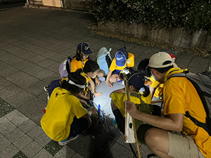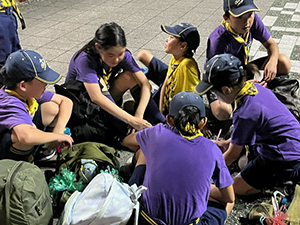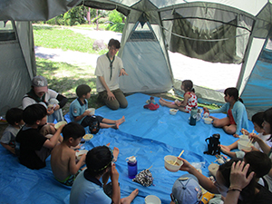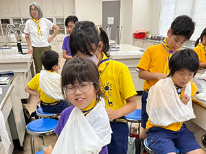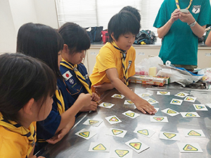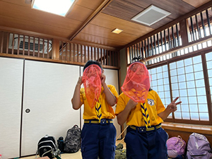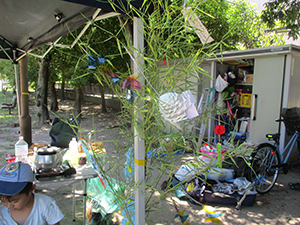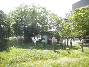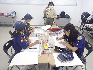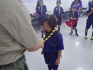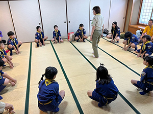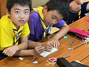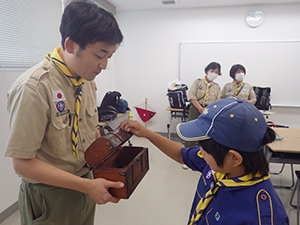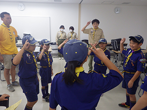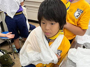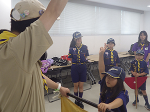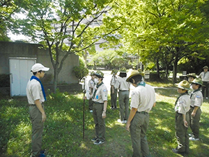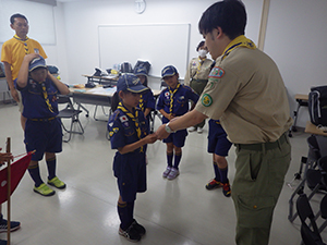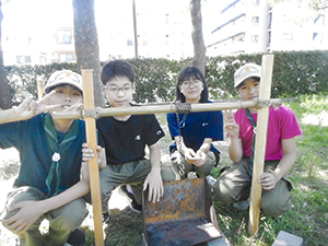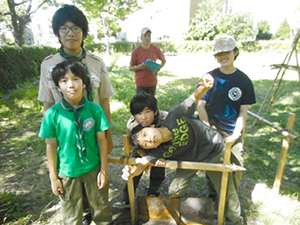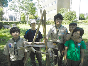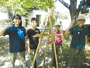 ボーイ隊は酷暑の日曜隊集会久しぶりに9名もの大勢のスカウトが出席してくれて指導者は感激! 集会開催セレモニーとH副長の県連有功章受章伝達式の後、夏のキャンプに向けてのナイフ・なた・のこぎりの使用法、個人装備の留意点を座学、隊で準備する野営用具の点検を行いました。午後からは野営工作の作成を班で競い合います。前回の隊集会で立ちかまどの製作は習得済みなので、今日はそれ以外の工作。スカウトはハンドブック片手に麻ひもと竹と角材で奮闘しました。おかげで、7月末の一泊訓練キャンプ、9月の二泊隊キャンプの事前準備はバッチリ! 暑さに負けず頑張ろうと誓い合いました。(KTC)