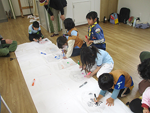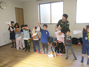 1月はお正月隊集会でお正月遊びがテーマ。みんなが持ち寄りのゲームを楽しみます。いろいろな種類のカルタや百人一首(坊主めくり)をビーバーパパママ混成チームで競います。そして、変わり絵工作、紙トンボ作り、お昼ご飯はカレースープ。そして、恒例凧つくり、次回が南地区凧揚げ大会なので、練習もかねての制作でそれぞれがグニャグニャ凧を作りました。そして小田南公園の阪神タイガース二軍球場横で凧あげを楽しみました。(K3)