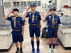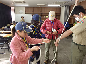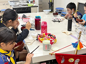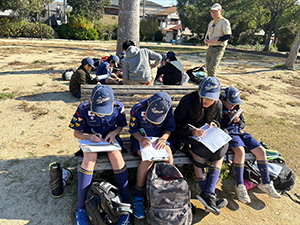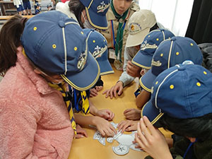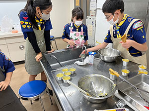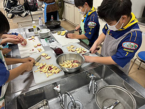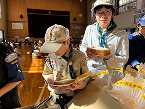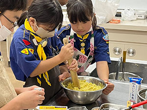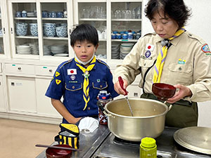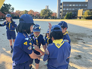 11月に行った芋ほりでのお芋を使って、組ごとに料理をします。1組はスイートポテト、2組は大学芋。買い出しから始まり、スムーズに料理に入ります。1時間半ほどで完成し、まずはリーダー特製の豚汁をおかずにお昼ごはん。おなか一杯食べた後に、それぞれの組で作ったスイートポテト・大学芋をおやつに食べます。自分たちで作った料理だけあって、どんどん食べられましたね。その後、来週のクリスマス会のためのソングを決めました。また、隊集会がおわった後に初めての月の輪集会を行いました。みんなで上進してくれるといいな。(M34)