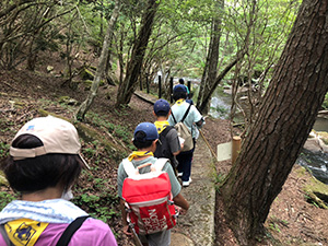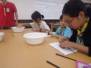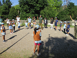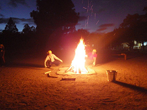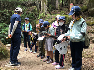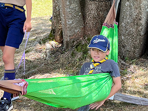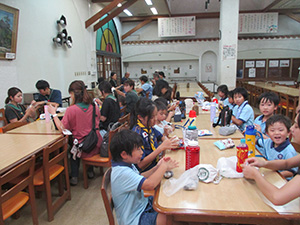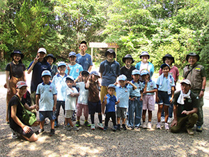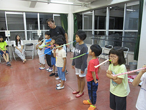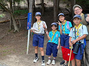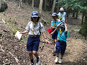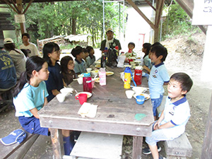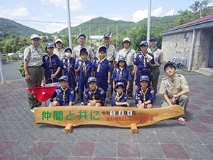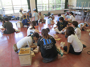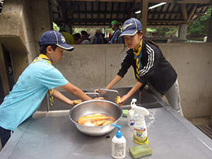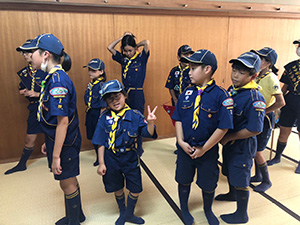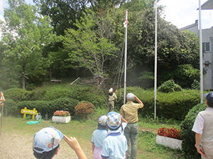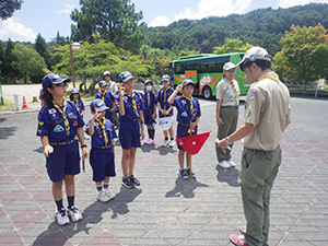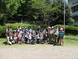 舎営二日目、奈良は今日も頑張って35℃越えとか。朝礼後、隣の民俗博物館へ小散歩。古民家を見てもあまり感動なし、それよりも死んだコガネムシやカマキリの方がズーと人気者。朝食後は、本来なら記念品工作か、お土産作りなのですが、今回は持ち帰らない記憶に残るものに挑戦しました。一部のBVは幼稚園なんかで知っていましたが、ほとんどが知らなかった西欧の積み木「カプラ」の初体験です。5つのチームに分かれ、一箱230ピースの積み木をいかに独創性豊かにくみ上げるか、あるいは単純に高くくみ上げるか、競い合いました。暑さを避け室内での行動に徹したので、楽でしたが、昼食は他団体でごった返す野外食堂。そんな中我が炊事班は,てきぱきと恒例ぶっかけうどんを調理し、時間通り食べさせてくれます。それを終えると閉営式。駅長さんから記念のカップとBSには松の火付けギアをプレゼントしていただき、「風とんぼ」に別れを告げました。真昼間の35℃越えの中、バス停までのミニハイク、そしてバス、大和路快速大阪経由尼崎と順調に進み、予定時間より早く解散できました。暑かったけれど、全員けが病気無く無事終えることができました。(K3)