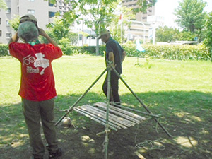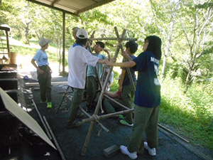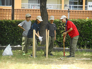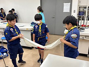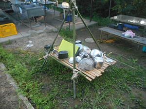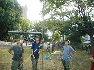 地区合同野営に向けての最終準備集会です。7月の訓練キャンプで実施できなかった野営工作(テーブルと水置き場)の組立方法や班旗立て競争に必要なロープワーク等を確認し、午後から実際に組み立ててみます。班旗立てでは均等なペグうちでないにもかかわらずなぜか15秒以上自立! 偶然でも素晴らしい、、少しずつ班で全員が役割分担し協力し合うようになってきました。この調子で元気に長期野営を乗り切ってほしいものです。 (ヒラマー)