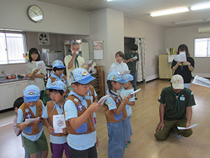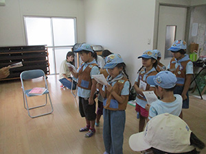 連日の猛暑を避けて今年度初めての室内隊集会。屋外との温度差マイナス10度。クーラーのありがたさをしみじみと感じます。8月の団舎営に備えて、内容説明とソング練習。2023舎営の歌、あまななビーバーの歌、旗揚げの歌の三曲を完全マスターし、ご褒美にN副長シンガポール土産のマーライオンチョコ。そしてお昼はウインナードッグとジュースでおなかを満たしました。外へ出ると暑さでクラクラしますが、この夏を楽しい夏にするため、しっかり活動しましょう。(K3)