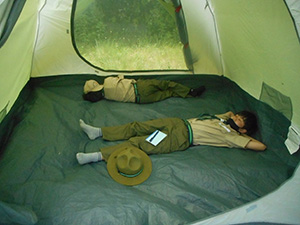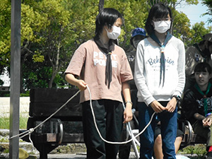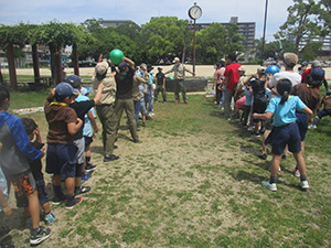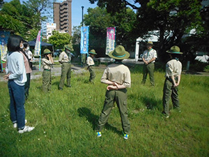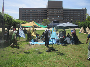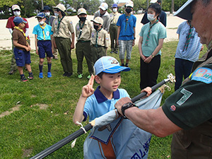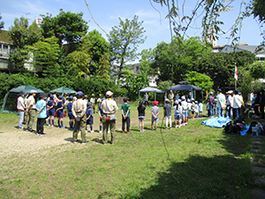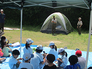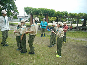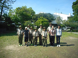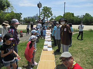 2023年度体験入隊は「ダイモツデイキャンプ」ボーイスカウトと遊びませんかというテーマで、大物公園で開催されました。事前申し込みが20人以上あり準備が予想以上に大変でしたが、結局当日参加は9家族14人にとどまりました。朝から快晴で、集ったスカウト、リーダー、保護者はプログラムの準備に大忙しでした。去年までの木陰が全くない状況で、内容を企画段階から大幅変更し、午前中はF-1カー工作とその競争、午後からはゲーム中心で活動、おやつのポップコーンを食べながら、ボーイ隊のロープワーク、テント説明、カブ隊のソングを楽しみました。マーキーやタープを総動員して暑さ対策をしましたが、今更ながらあの緑いっぱいの木陰が欲しいなと思いました。ともあれ、これで新しい仲間が少しでも増えたらいいな。(K3)