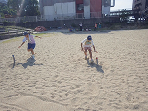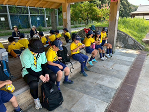 猛暑の続く中、夏舎営当日を迎えました。集合時に、団委員長からアイスの差し入れ。元気が出たらいよいよ出発です。宿泊場所の近くの砂浜と公園でしばらく時間を過ごします。大きな滑り台や噴水があって楽しいところでした。明日のイカダ作りで使うかも…でロープワークも少々。3時ごろに施設に入り、宿泊室『咸臨丸』へ。荷物を置いたらすぐに、夕食のカレー作り! こちらも順調で時間内で美味しいカレーを、夕陽を見ながら食べられました。夜はみんなで楽しくゲームをして過ごし、眠りにつきました。(M34)