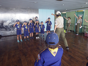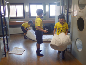 2日目も天気は快晴、暑そうです。朝ごはん、点検もスムーズで、部屋も例年に比べてとても綺麗です。しかスカウトがしっかりしてくれています。午前中は、イカダ作り&乗船。なんと、ふだんのロープ結び(本結び)が役に立ちました。スカウトスキルがあってよかった。暑かったけど、船の上は気持ちよかったですね。少し休んで昼からは館内探検とビーチコーミング。直射日光がすごいですが、日陰を探して一生懸命貝殻を集めます。夜はボンファイヤー。施設のマスコット『くらたん』を呼んで各団のスタンツはもちろん、いろんなゲームで楽しい時間を過ごしました。(M34)