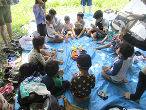 今年は夏季舎営を断念し、代わりにたっぷり夏遊びデイキャンプを実行。人出のことを考えて、あえて盆休み明けの月曜にし、仁川広河原へ電車・バスに乗り継ぎ甲山大師からミニハイク。先発隊と合流し、着替えてすぐに塩バナナをたべ、川の中へ。住吉川と違って森の中の自然の川感たっぷりで、さっそく水泳もどきや、恒例水行を楽しみました。お昼は中身たっぷりのホットサンドとスープ、食後はテントの下で新規入隊パパによる紙芝居3本立て。再度川遊びを楽しんで、帰路バス停までの苦しい登り道を元気いっぱい歩きました。ギャング一人増えてにぎやかになりました。(K3)