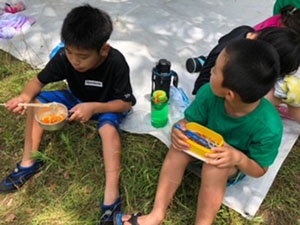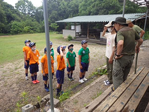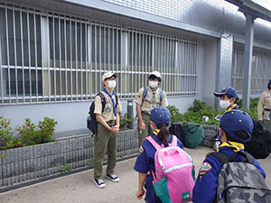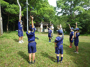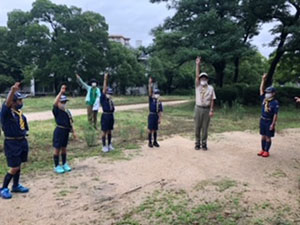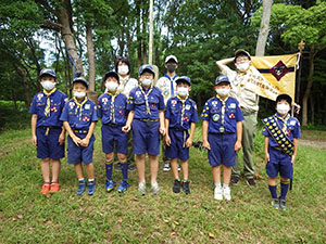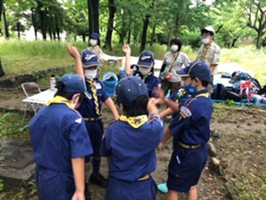 梅雨時で天気が心配される中、くまキャンプには7名全員のスカウトが集いました。今回はベンチャースカウト1名も参加してくれています。途中池上曽根遺跡に立ち寄って昼食を食べた後、信太山キャンプ場へ向かいます。到着後早速設営ですが、ここに来て雨に降られ、貸出のテントを試行錯誤しながら立てます。はじめてのスカウトもいましたが、何とか出来ました。夕食はハヤシライス。その後はみんなでゲームと、キャンプらしい楽しい時間を過ごしました。今回は仲良し男子7名なのでお喋りにも花が咲きます。遅くまで5年生らしい内緒話が聞こえておりました。そのせいか?2日目の朝はみんなねぼすけ状態。しかしいいお天気なので早速テントの乾燥をします。夏らしくスイカ割りもやって、キャンプを満喫。ベンチャースカウトからはボーイ隊が楽しみになるお話をしてもらい、帰路に着きました。いつも以上に楽しい声がたくさん聞こえた2日間のキャンプでした。このくまスカウトで、また色んなことをやりたいね!(M34)