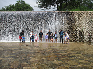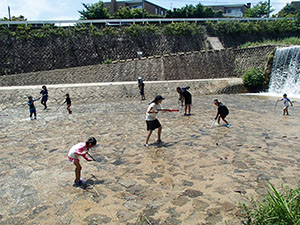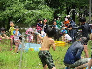 大物水鉄砲戦争のあとは、恒例の住吉川水鉄砲ハイク。天候不安定の中今までの最小人数での実施でした。魚崎駅から川沿いに炎天下をがんばって歩き、予定通り上流の新落合橋に到着。着替テント設営後、貸し切り・水使い放題・濡れ放題の水遊びを堪能しました。またまたコロナが蔓延し始めましたが、ここは別天地、マスク無しで水鉄砲を楽しみました。都賀川が大腸菌汚染で使用出来ない中、自然の川遊びが出来る住吉川はとても貴重です。昼食後はダムの上流も探検し、自然を満喫しました。帰路は40分で魚崎駅に到着し、ご褒美の「ア」をいただきました。(K3)