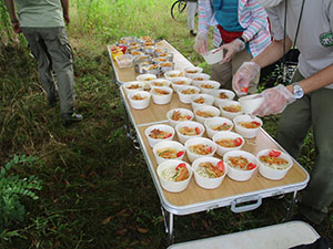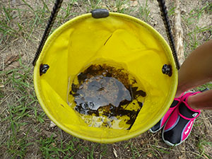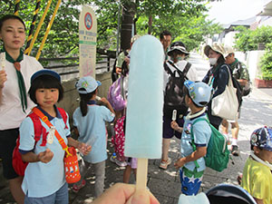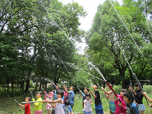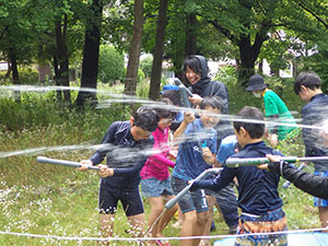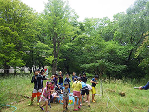 真夏到来! 先週の予定が雨で本日に順延実施。カブ隊と合同で水鉄砲制作と平和な水鉄砲戦争。セレモニー後すぐに制作に入りましたが、みんな手慣れた物です。すぐに完了し、水着に着替え戦闘開始。最初はBV対カブで容赦ない水かけが繰り広げられました。休憩後再開、その間おいしそうなかき揚げのにおいが漂ってきます。お昼ご飯の準備も着々と進んでいます。ずぶ濡れになったところで、昼食タイム。おいしいかき揚げうどんを頂きました。そして、水風船投げから午後の戦闘再開。今度はアダルト対スカウト全員。いくら濡れても今日はまさに無礼講、興奮の中やっと終わりを告げました。ビーバーのおやつは先々週採取のマルベリージャムのクッキーのせ。おいしかったね。今日1年生女子が正式入隊しました。やっと5人です。(K3)