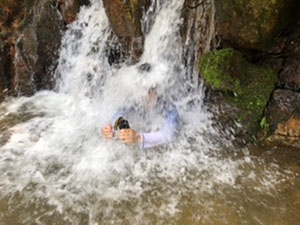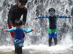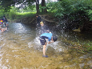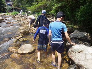 昨年に続いて、仁川渓谷での川遊び。行事前の1週間天気がぐずついており心配でしたが、ひとまず現地へ向かいます。行きのバスは、同じ行き先の団体と丸かぶりして満員状態で甲山大師まで。そこからは徒歩で河原へ向かいます。昨年より雨の影響でかなり水量が多く、沢登りは途中まででしたが迫力満点。いきもの探しも捗り、今回はよりたくさんの種類を見つけた1組が優秀組となりました。安全確保を兼ねて、ベンチャースカウト2名にも手伝っていただき、とっても助かりました。(M34)