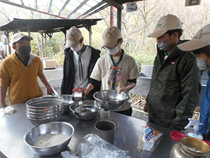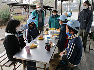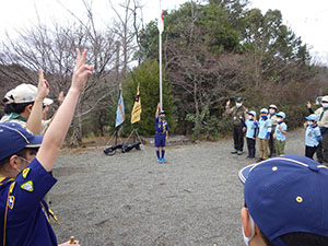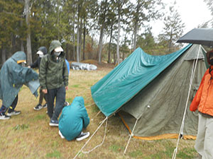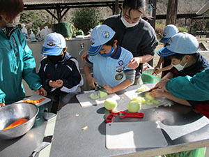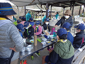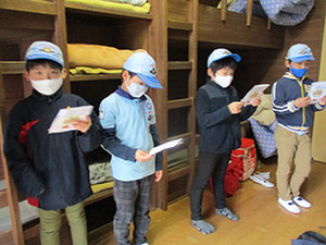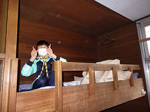 2年振りの舎営で、尼崎市立青少年いこいの家に1泊2日で行きました。スカウトの大半がカブでのお泊まりは初めてでした。1日目、開営式までは予定通りに進みましたが、さぁ活動!!という時に雨が降り出し、工作は中止となりました。けれども焼きマシュマロは何とか実行し、大満足。その後も雨は降り続きましたが、夜は懐中電灯を持って、キャンプをしているボーイ隊の様子を覗きに行きました。テントの設営や野外炊爨をしている姿がかっこよく見えたかな!? ボンファイヤーでも、しっかり仕切ってもらいましたね。何年後かに、カブスカウトもあんな風になるのかなぁ、と楽しみです。2日目も降ったり止んだりの雨に振り回されましたが、野外炊爨でカレーを作りました。みんなで協力して作っていて、どちらの組もとても美味しかったです。最後は入れ替わりで来られた26団に「神様お願いじゃんけん」対決で見事勝利し、気持ち良く締めくくりました。このゲーム、楽しかったので、また7団でもやりましょうね。(M.Y)
