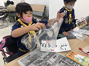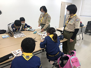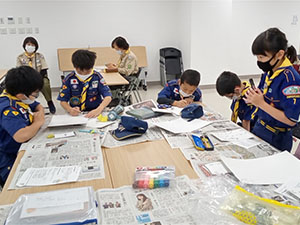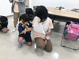 今日は小田南生涯学習プラザでの活動でした。午前だけでしたが内容は盛りだくさん。まずはカブラリーに向けての準備のひとつ、カルタ作りです。テーマは「安全」。与えられた文字から始まる、字札と絵札8組のカルタを作りました。お家で考えてきた句から選ばれた作品はそれぞれ素晴らしい句でした。おまけに絵も上手で、良くできたカルタに仕上がりました。次は〝セーフティエキスパート〟のチャレンジ章取得に向けて普段の生活の中での危険な箇所を各組で話し合いました。その他、三角巾を使っての腕吊りの練習や尼崎市の消防団について勉強しました。三角巾はスカウトの身体には大き過ぎて扱いにくいうえ、ロープ以外での本結びに慣れていないので苦戦していました。カブラリーでもするそうなので、本番までには上手く出来る様になってほしいです。(Y.M)