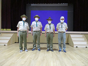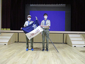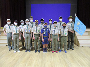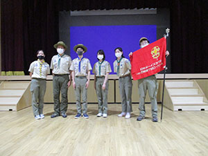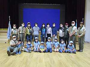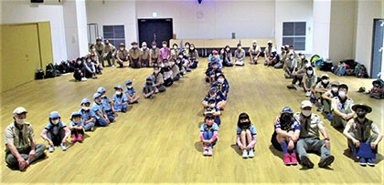 花散らしの雨が降る中、今年度入隊上進式が、真新しい小田南生涯教育センターで行われました。団結成70周年ですが、結成以来最小登録人数、最小上進数という逆風下のセレモニーでした。しかし元気さ積極さは変わらず、かろうじて7団の伝統を継続する事が出来ました。コロナの猛威は収まることなく今年度も続きそうです。この状況下、あらゆるコロナ対策を行い元気な活動を継続する熱意をみんなで共有した一日です。(K3)