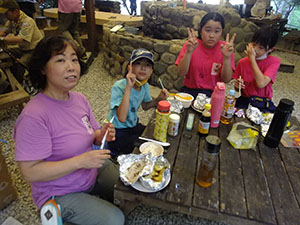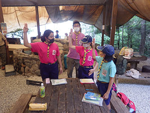 月の輪3人が大物駅に集合。駅前のMaxValuで買い出しをしてから阪神・阪急を乗り継ぎ、箕面市教学の森野外活動センターに到着。すごい坂だったね。さっそく3人で手分けして、ご飯とおかず2品を作りました。初めての飯ごう炊さんは、水加減を間違えてちょっとコゲができちゃいましたが、その他おかずはなかなかな出来。おいしく頂きました。洗い物の後は月の輪基本訓練。ボーイの敬礼やスカウトサイン等を学びました。最初から最後まで楽しく過ごした1日。このまま皆で一緒に活動出来たらいいね。(29Da)