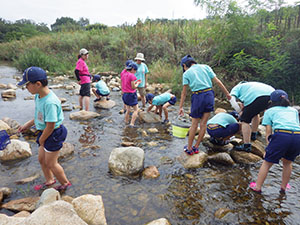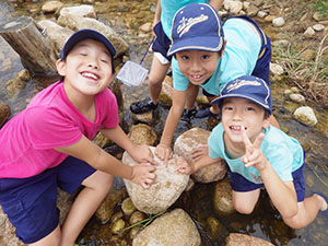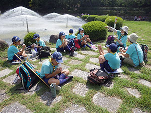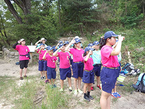 スカウトデーから変更の生き物調査2回目です。前回は海バージョンでしたが、今回は河バージョンです。どんな生き物がいるか楽しみ。いつものルートとは違いJR西宮→阪神国道→仁川から甲山に向かい、途中イノシシに遭遇し、展望台に到着。その後、噴水広場にて昼食。しっかり腹ごしらえしてからいざ広河原へ。ビーチシューズに履き替え、さあ生き物探しです。みんな半ズボンが濡れるのも気にせず一生懸命捕まえました。魚は小さくて何かわからなかったけどアメンボや水グモなんかもいました。楽しかったね。最後はゴミを拾って帰りました。本当は沢登りの予定もありましたが、急に涼しくなリ断念。また来年来れたらいいね。(yukko)