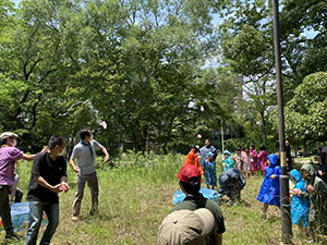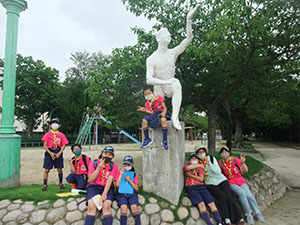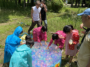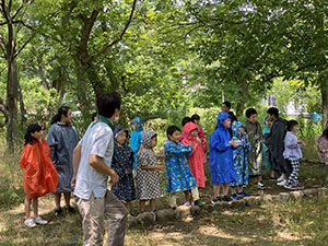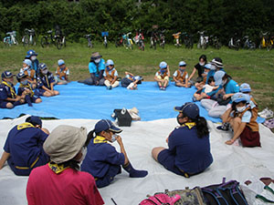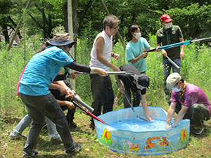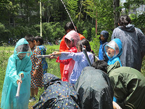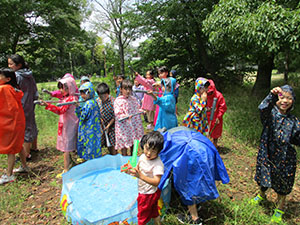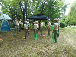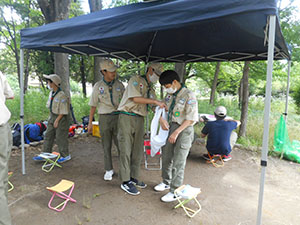 梅雨空の中、実施かどうかすら迷っていた集会でしたが、集まって1時間もすると日がさしてきて暑いくらい。昼食後解散くらいの気持ちでしたが、晴れてくると当初の計画、水鉄砲が再浮上。水着はもってきていませんが、そこは「そなえよつねに」のスカウト、雨具があります。コロッケドッグとスープの昼食もそこそこに、ズボンパンツは濡れるの覚悟で、水風船投げを開始。その後、スカウト対パパ・ママ・リーダーの水鉄砲合戦を行い、みんなずぶ濡れになりました。でもマスクを外し、思い切り野外で遊べる楽しさを再認識した一日でした。まだまだコロナ対策油断は出来ません。(K3)