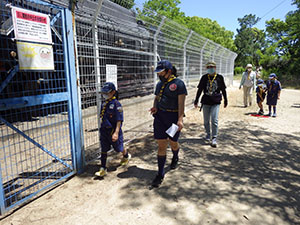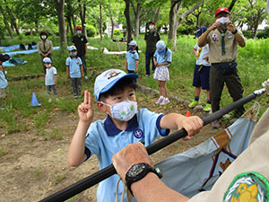 新型コロナ対策での活動自粛緩和に基づき、短縮バージョンでの隊集会を50日ぶりに大物公園で実施しました。3密対策はもちろん、消毒、マスク着用と対策はばっちり。本来なら団体験入隊の実施予定日でしたが、すべて中止となり、みんな自宅待機状態でしたからこの青空と自然の風に感謝です。人のいなかった公園は、ハルジオンなど野草がビーバーの背丈くらいのび、至る所に生い茂って今までとはちょっと異なった状況でした。そんな中、みんな元気にあつまり、新規入隊の残り1名の入隊式、副長1名の誓いの式を行うことが出来ました。そして、非接触ゲームや公園探検ビンゴを楽しみ、お昼は栄養たっぷりの牛丼。おやつは焼きマシュマロとジュース。コロナぶっとばせ缶バッジとシールをもらい、いよいよ本格活動開始だ!(K3)