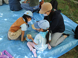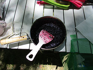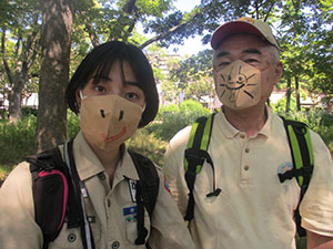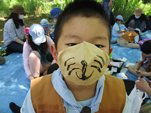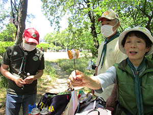 快晴、微風の初夏を思わす大物公園での、活動自粛解除後2回目の隊集会。今回も、公園探検と公園の味をテーマに実施しました。その前に、コロナ対策と熱中症予防で使い捨てマスクの制作を行い、活動中はそれをつけて行動しました。さて、大物公園の味は、初夏の味覚マルベリー(桑の実)です。公園のすぐ横の建具屋さんのご好意で、真っ黒に熟した実をいただき、ジャムにしていただきました。また、前回好評だった焼きマシュマロもビスケットにはさんで食べたりして、いろいろなバリエーションをたのしみました。大半がカブに上進しましたが、元気なビーバーはコロナに負けず活動を続けます。(K3)