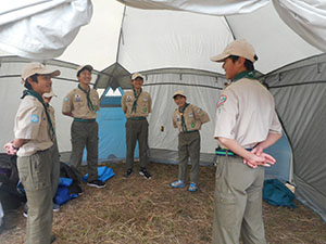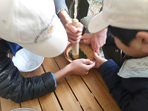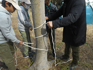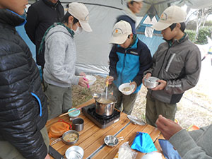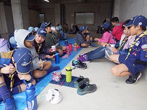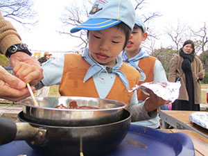 今日のボーイ隊隊集会は、冬晴れの大物公園で進級訓練とB-P祭のスタンツ準備です。午前中はロープワーク。何度も何度も繰り返し行い、7名全員が2級の課題を全てクリアすることができました。温かい豚汁で体を温めた後はB-P祭のスタンツ準備です。公園の小枝で小道具をつくり演出にも熱が入ります。おやつによもぎ入り団子をつくりお汁粉にして再度体を温めて解散。小雪が舞う寒い1日でしたがスカウト達は元気いっぱいでした。(ひらマー)