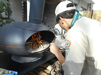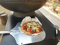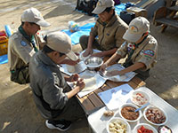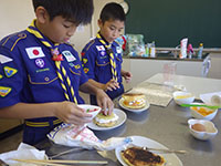 今日のボーイ隊隊集会は近くの慈愛保育園のピザ釜を使わせていただき、手作りピザに挑戦です。参加者はスカウト7名・リーダー3名。資材搬入後、早速生地作りから始めます。手をベタベタにしながらこねて丸めて温めた鍋へ。発酵完了後いよいよオリジナルピザ作成です。25cmに伸ばした生地に様々な材料をトッピングし、どこにも売っていない不思議なピザが16枚出来ました。400度になったピザ釜で3〜4分焼いて出来上がり。焼きたてピザの味は最高です。あっという間に平らげてしまうスカウト達にリーダーもびっくり! 撤収後大物公園に戻り進級訓練を行っていたところビーバー隊がハイクよりご帰還。おすそ分けしたピザを喜んで食べてくれてスカウト達も嬉しそうでした。(ひらマー)