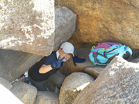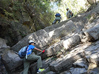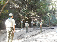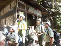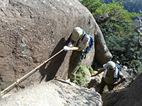 秋晴れの中、ボーイ隊は久しぶりのハイクです。参加者はスカウト4名、指導者3名。行き先は風吹岩より荒地山へ。なんなく高座の滝に到着後、ロックガーデン中央綾尾根の西にある地獄谷へ。セレモニー後、靴ひもを締め直し、軍手をはめて、指導者に三点支持を教えてもらいながら滝や巨岩をいくつも越えていきます。スカウト達は怖いのか口数も少なく必死。ショーベン滝から万物相への道をロストし、中央綾にでてしまいますが結果オーライ。予定通りの時間に混雑している風吹岩に到着しました。水の多い横池にて昼食後、荒地山へ。頂上(549m)に到着後休憩もそこそこに、わかりにくい道を巨岩の合間をぬって一気に下ります。まず、縄梯子にびびり、やっと下りたと思ったら「七衛門ぐら」の穴くぐりを体験。リュックを背負ったままでは通れない穴を通過します。そして「岩梯子」。狭い段状の岩を下りるのですがほぼ垂直なので足元が見えず、下りは特に危険です。怖さで一時動けなくなってしまうスカウトも! 岩梯子の上と下で隊長・副長の怒号がとびます。なんとかクリアし、朝セレモニーをした地獄谷入口に全員無事到着。けが人が出なかったことに指導者たちは一安心です。もはやハイキングではなく、ロッククライミングの1日となりました。(ひらマー)